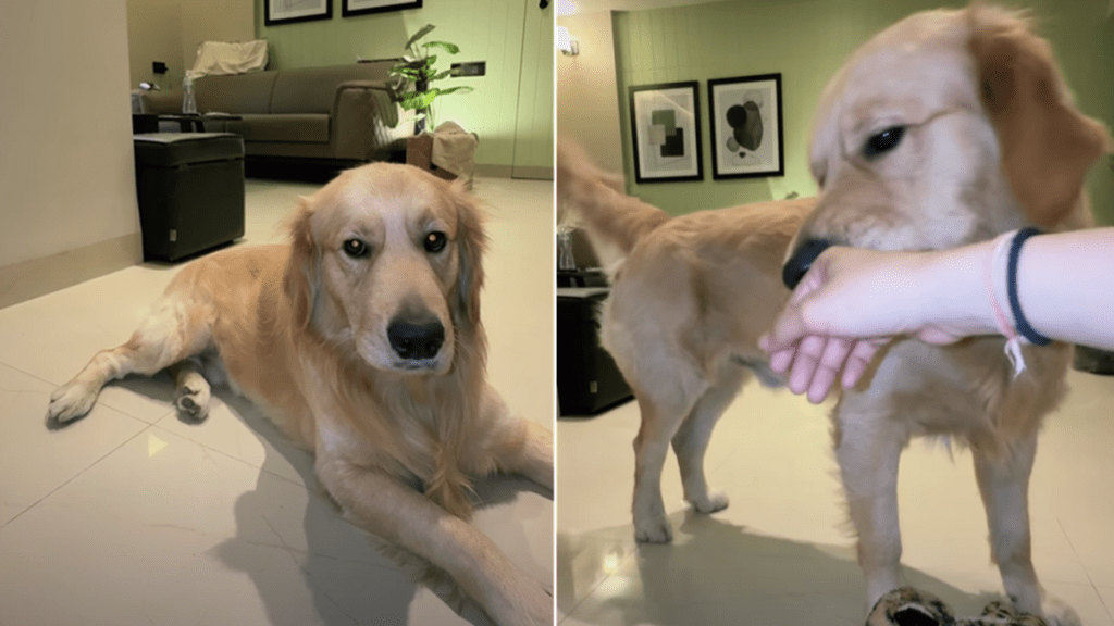 In the video, the Golden Retriever lounges on the floor, looking calm and relaxed as his mom speaks to him in a baby voice, saying things like “Hi, my baby” and “My baby is so cute.” That’s all it takes for the dog’s tail to start wagging like someone flipped a switch. But the moment she drops into her normal voice, the tail immediately sits down.