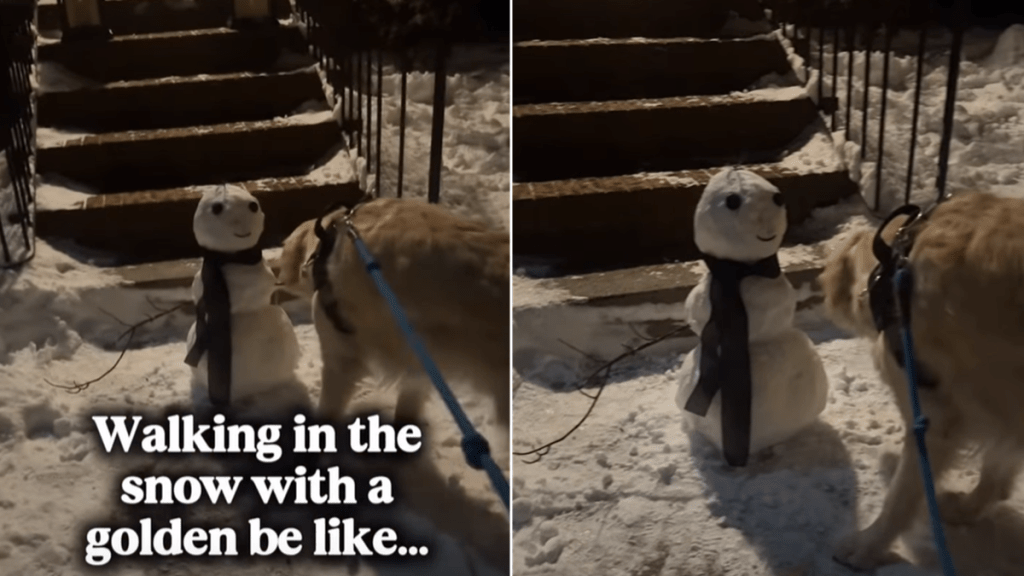 A golden retriever snowman clip is cracking people up online. It is the kind of moment every dog owner recognizes instantly. It starts like a normal winter walk, then turns into a tiny heist. Hurley spots a small snowman on the sidewalk and locks in. He decides that stick arm belongs to him. The owner narrates the whole thing in real time. Hurley, meanwhile, struts off like he just found treasure in the snow.
