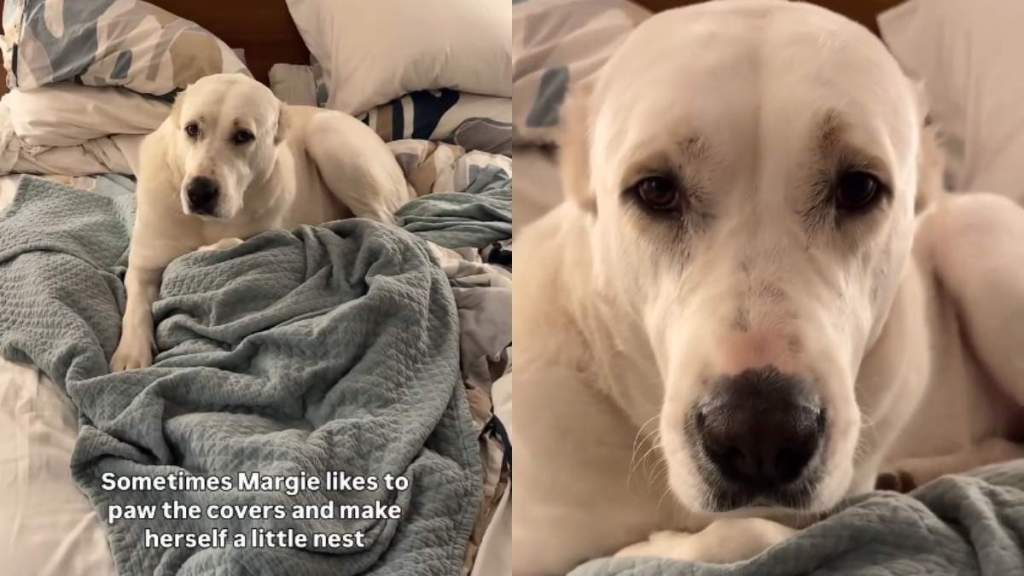The dog dad then explains Marge’s routine for anyone new to her antics, saying, “Sometimes Margie likes to paw the covers and make herself a little nest,” further asking the dog, “Are you burrowing for the winter? You making a bear hibernation? Is that what you’re doing?”