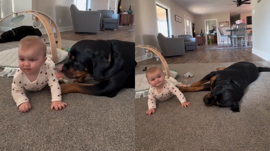 In a cute dog baby video on Instagram, a paw parent captures the moment when their Rottweiler and the little human flop on the floor in perfect sync. “Adding some sweetness to your feed,” an on-screen line reads. Then, the clip shows the duo lying on a carpeted floor and playing.