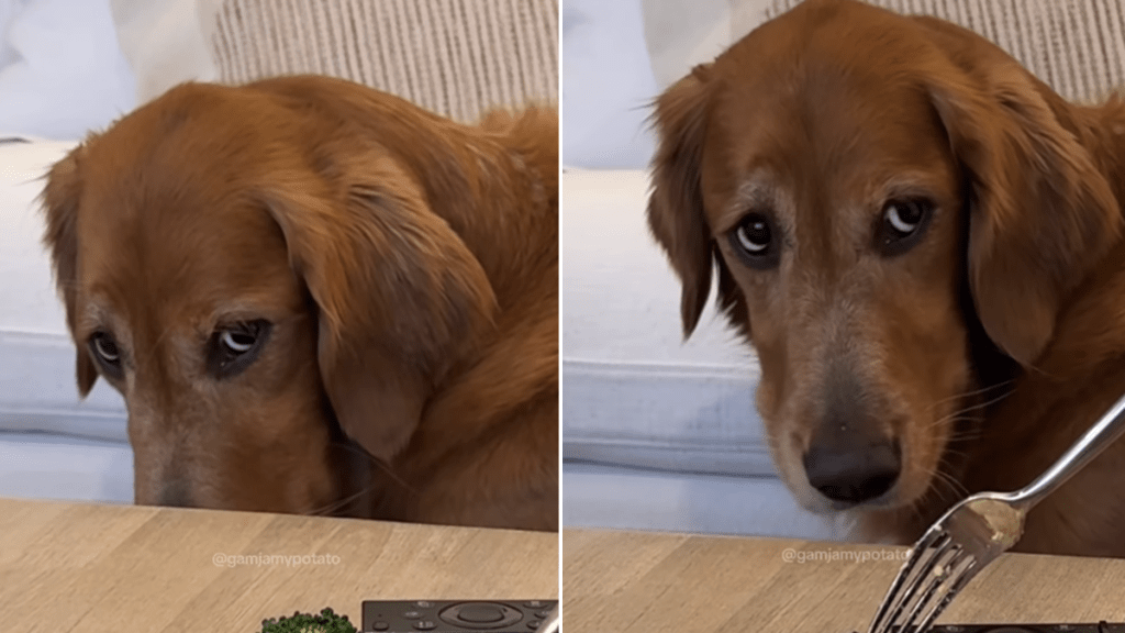 Golden Retrievers are social and food-motivated, so they often hover near meals. Many learn routines fast and test what gets a reaction. Gamja’s slow head drop and side-eye likely work because it looks gentle and polite. The clip turns that habit into a tiny performance.